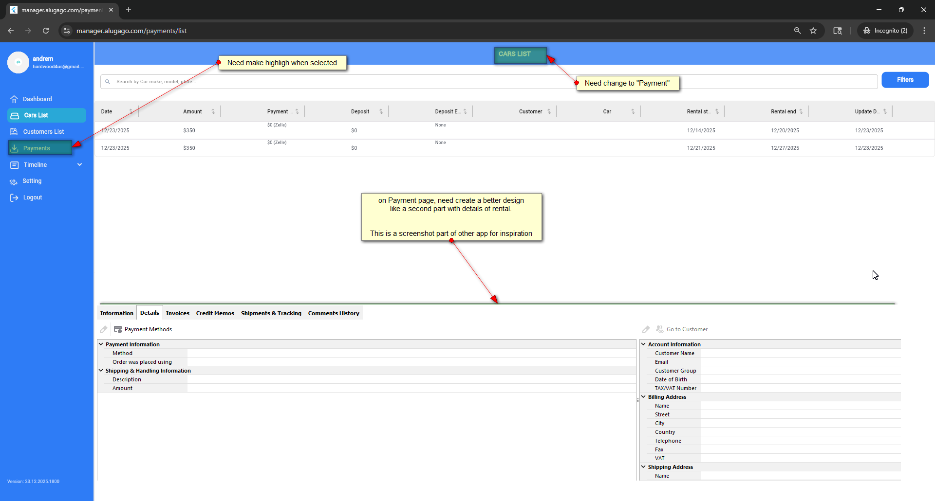 I have implemented the backend for the payment page to display all user payments. Please note: payments from previous bookings are not shown due to missing data fields, but new booking payments display correctly. The filter currently only shows records without refining by customer or car name.