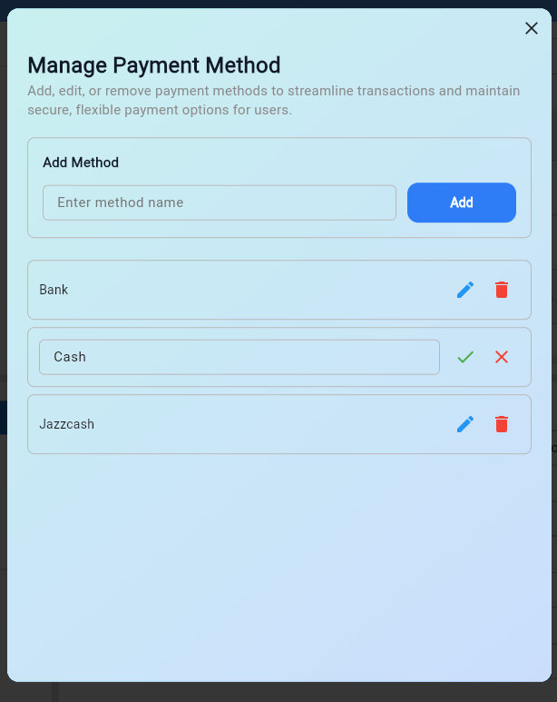 The Payment Methods section is fully functional — you can now add, edit, and delete payment methods properly.
