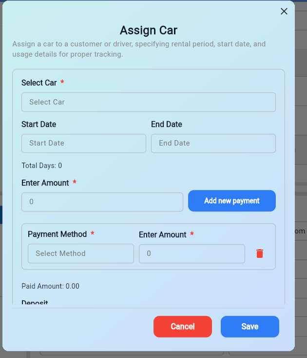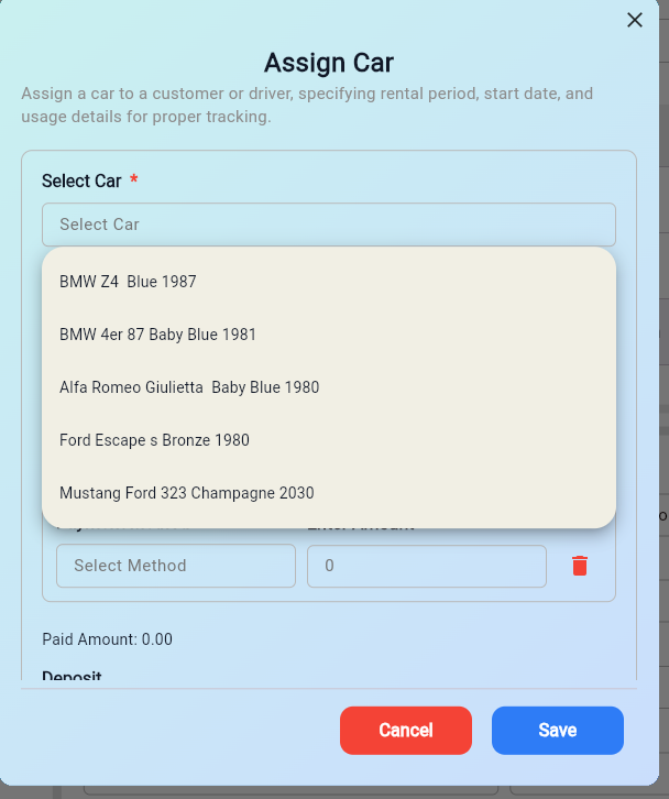 The Assign Car section allows assigning and reserving cars by selecting a car and a payment method. The last button opens the Payment Method section and saves the rental.