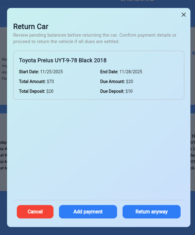 Design the Return Car dialog that allows users to either return a car or add a payment directly within the rental history section.