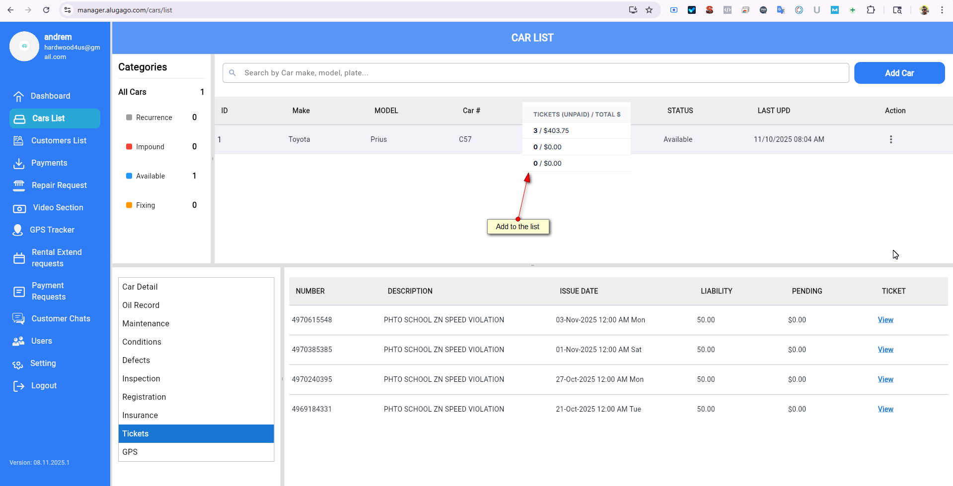 Add tickets to the car list