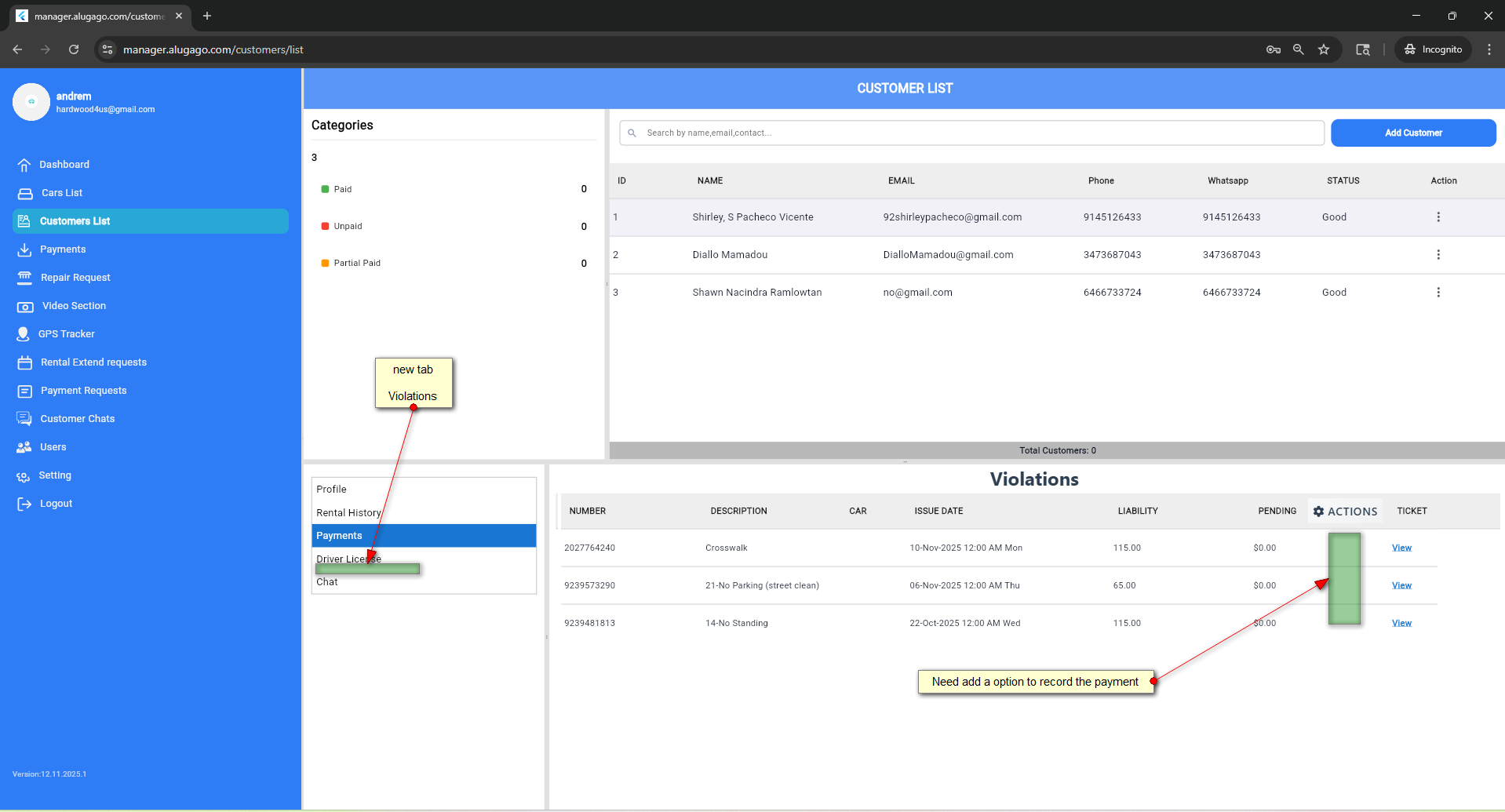 Violation tab add in Customer list Page in Mobile and desktopn view