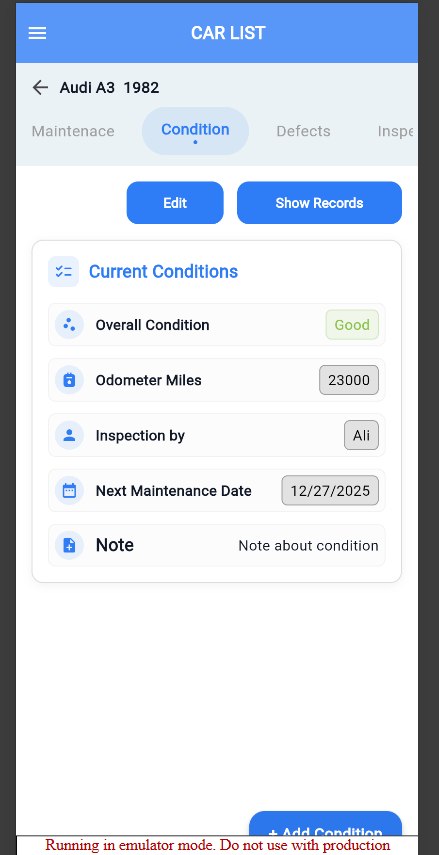 Create Car Condition tab to show Condition records and add, edit , delete Condition.