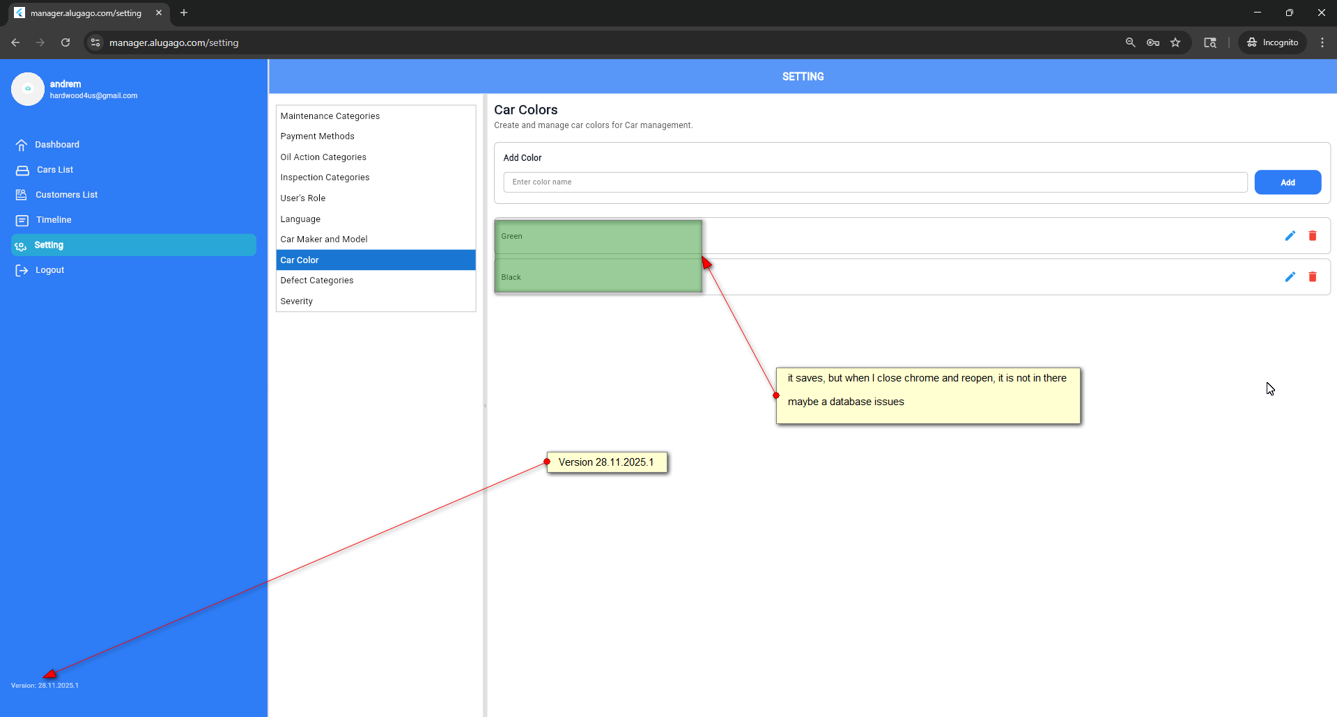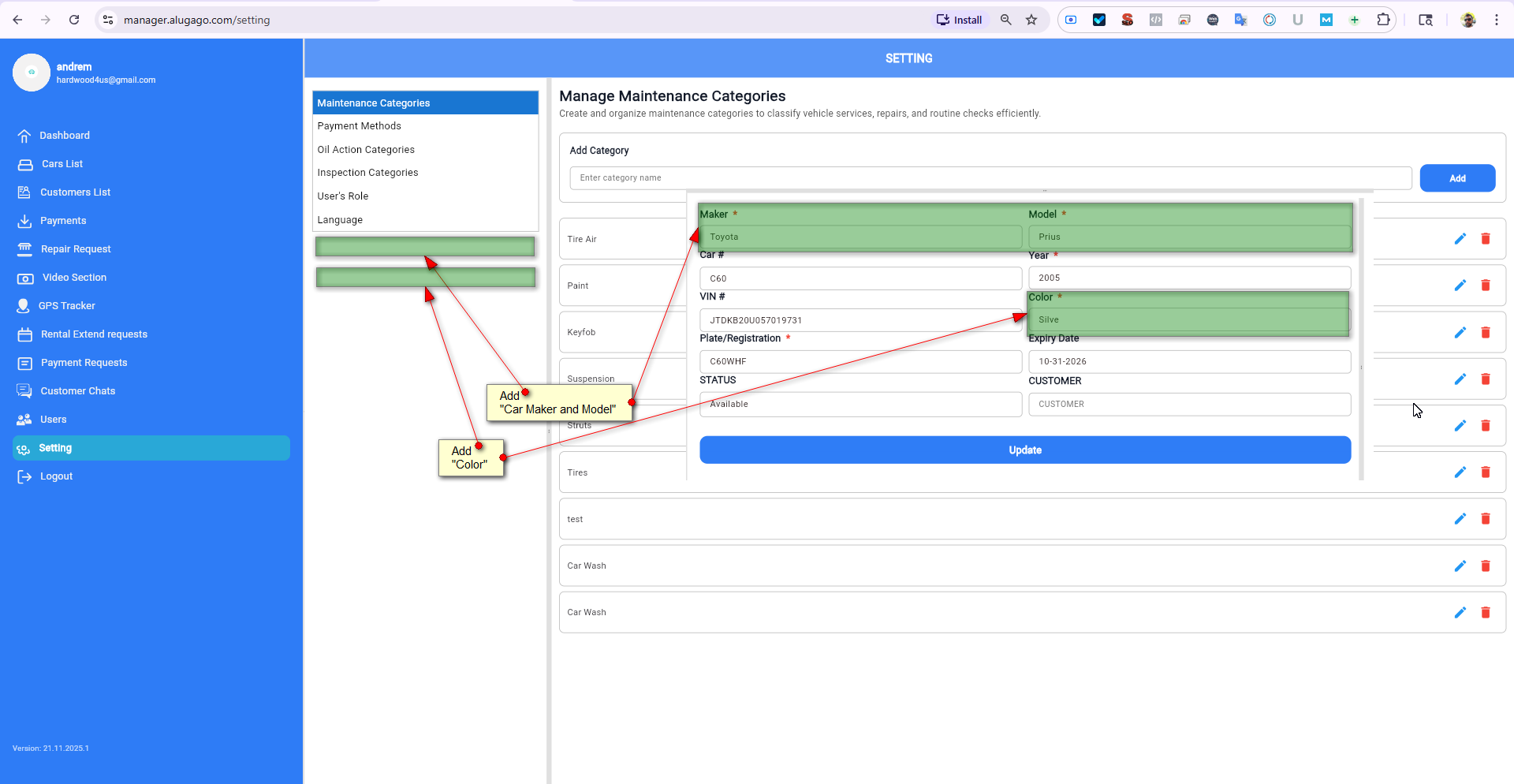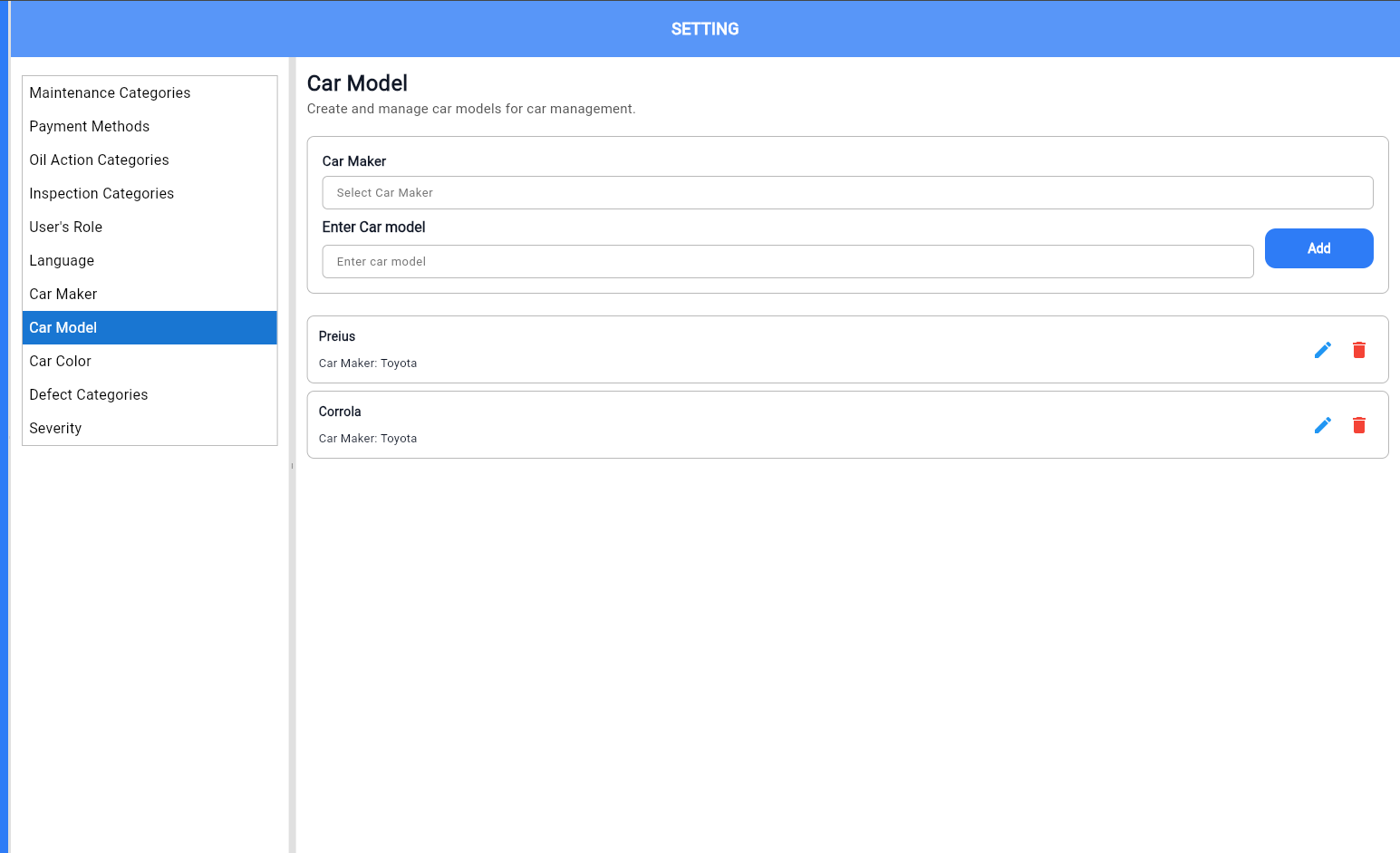 closedV 22/11/25 Setting add car Maker, Model and Color