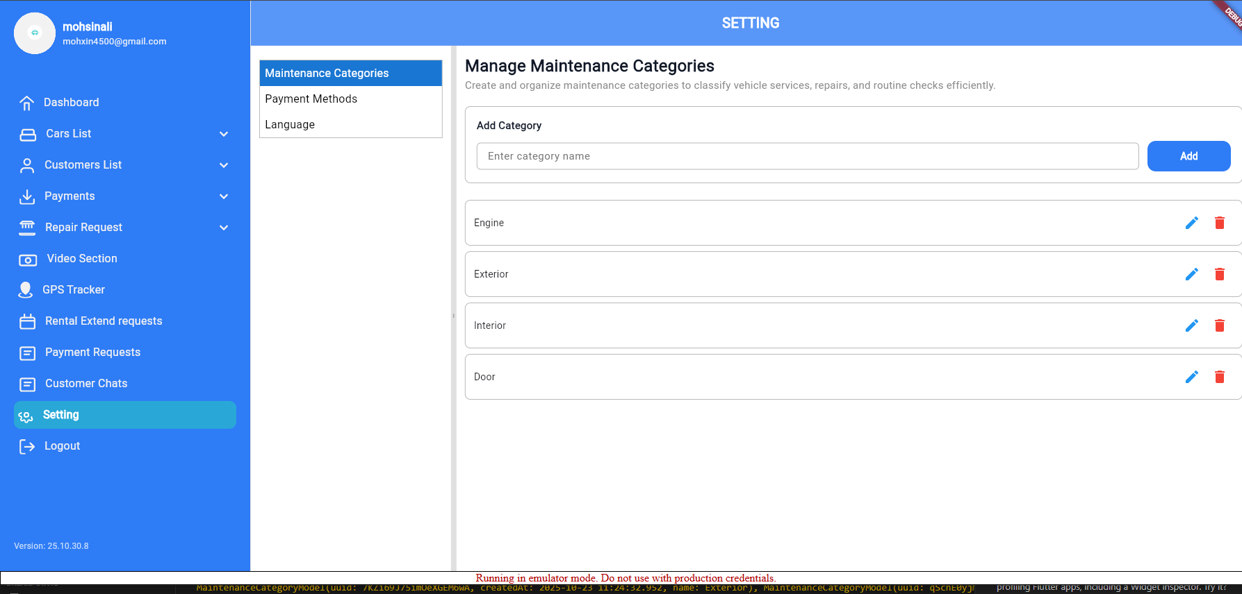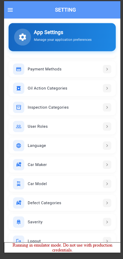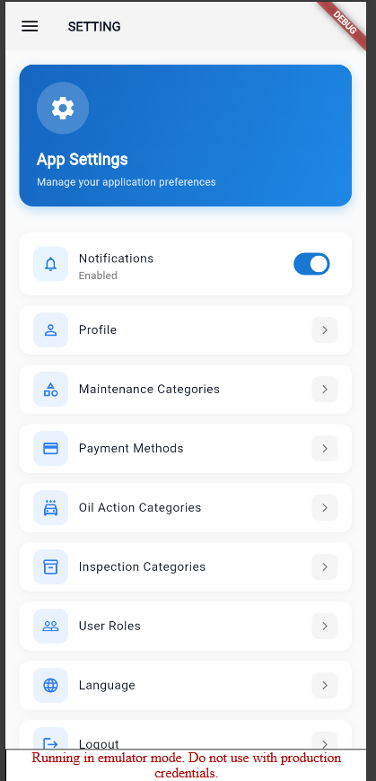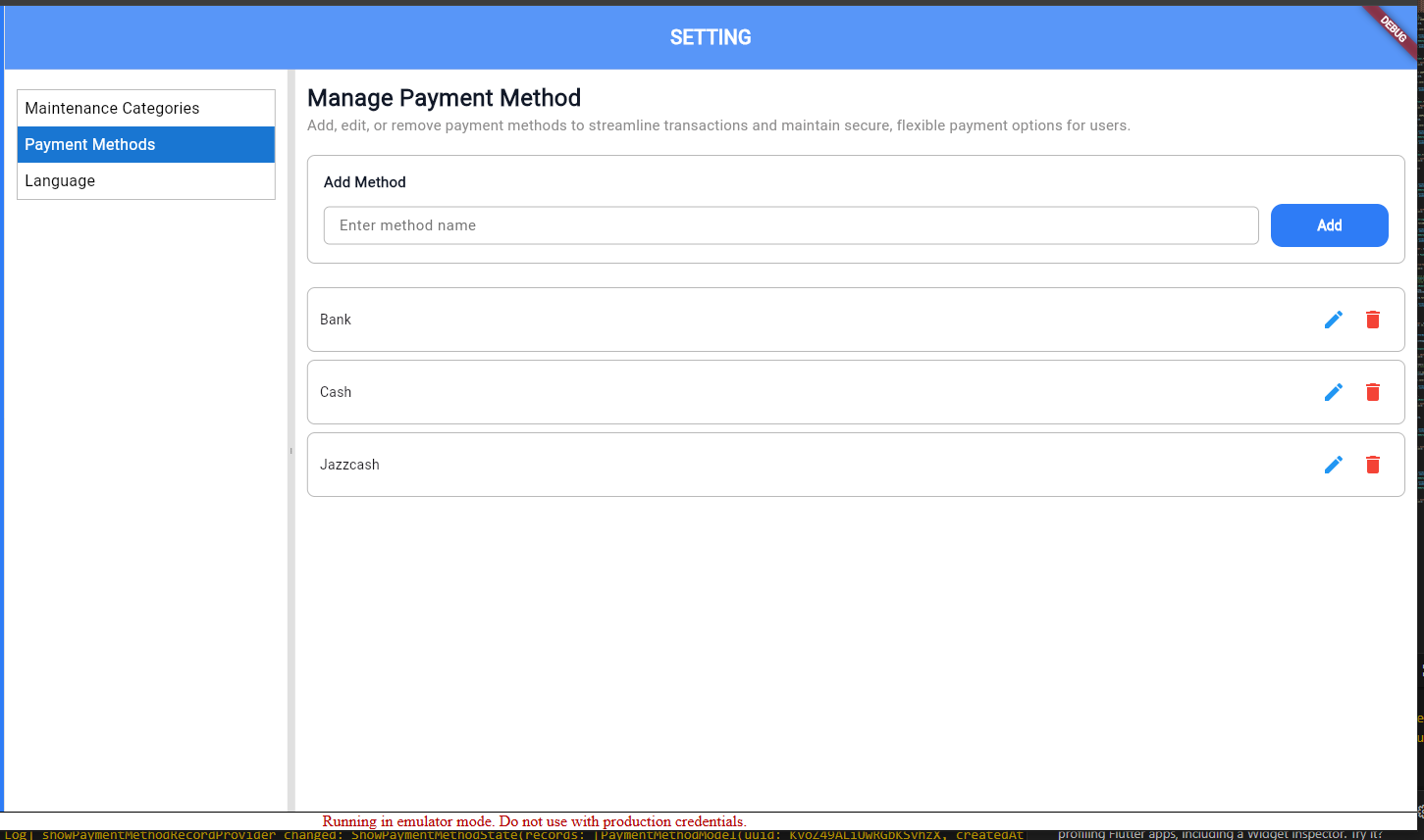 Setting screen to manage Maintenance category, Payment method and app language.