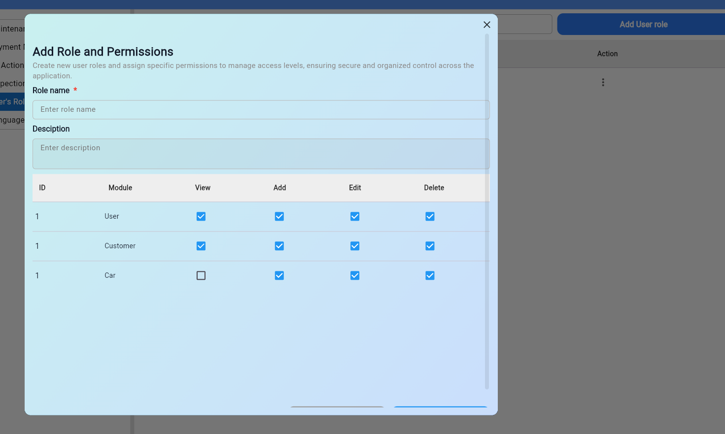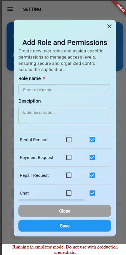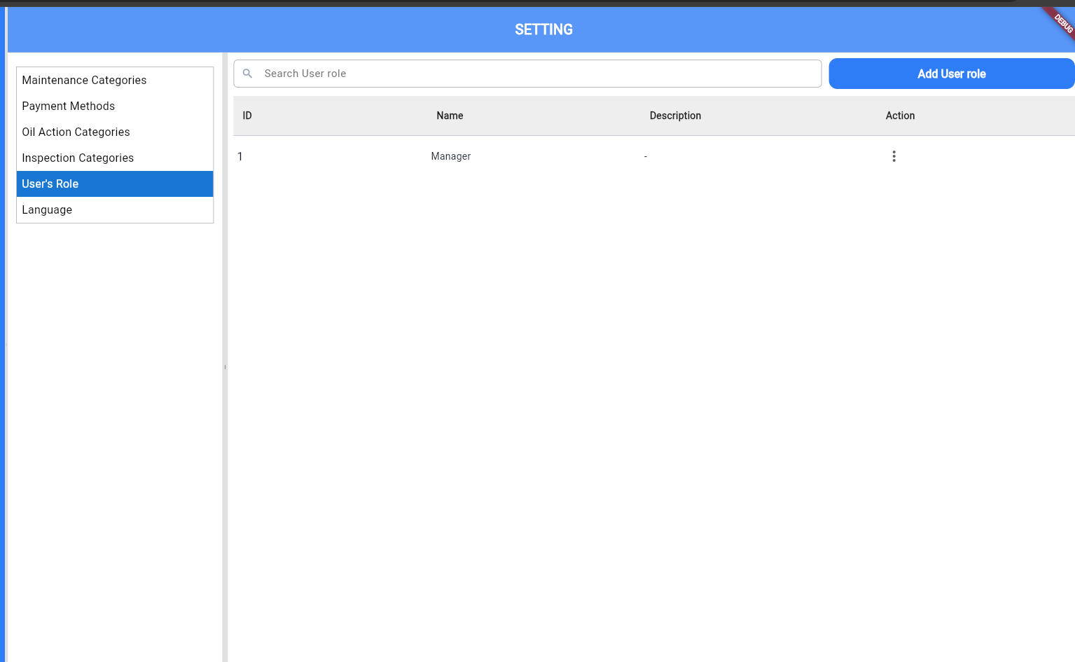 Add a User Role section in the Settings screen to create roles and assign role-based permissions.