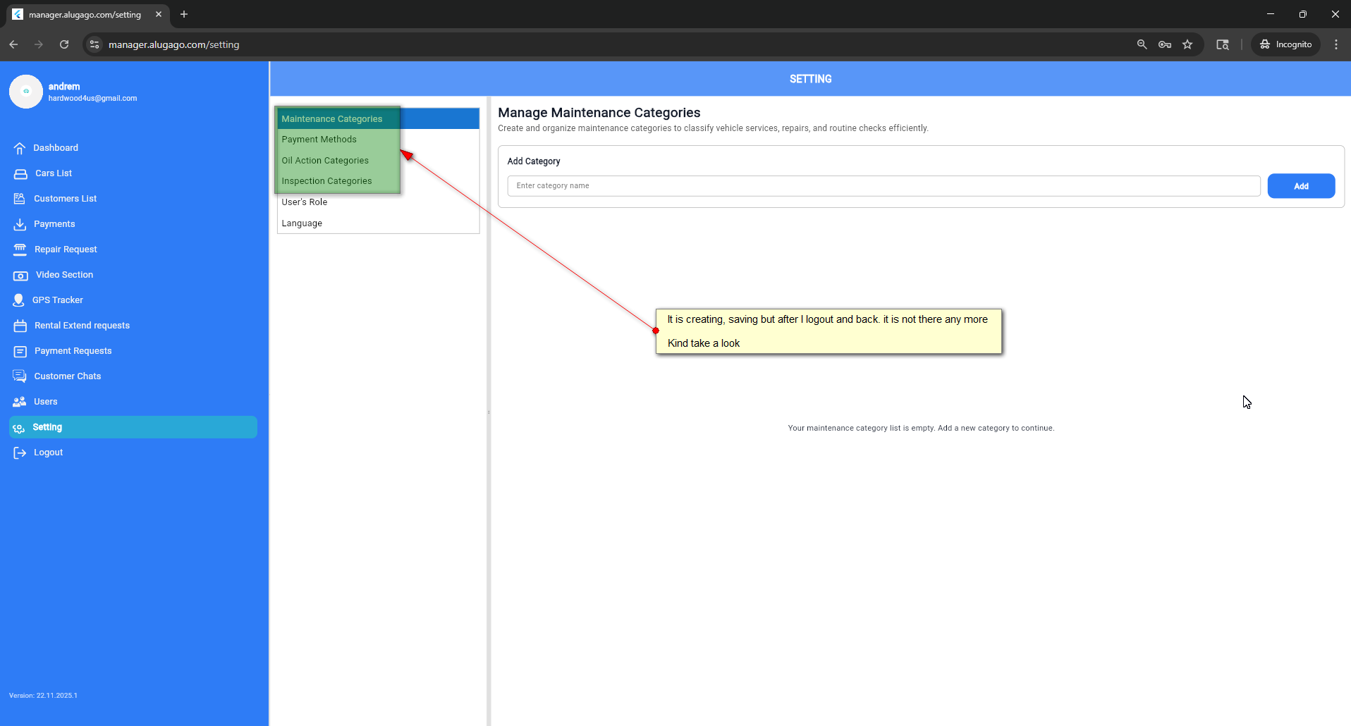 closedV 22/11/25 Settings Categories are not saving properly