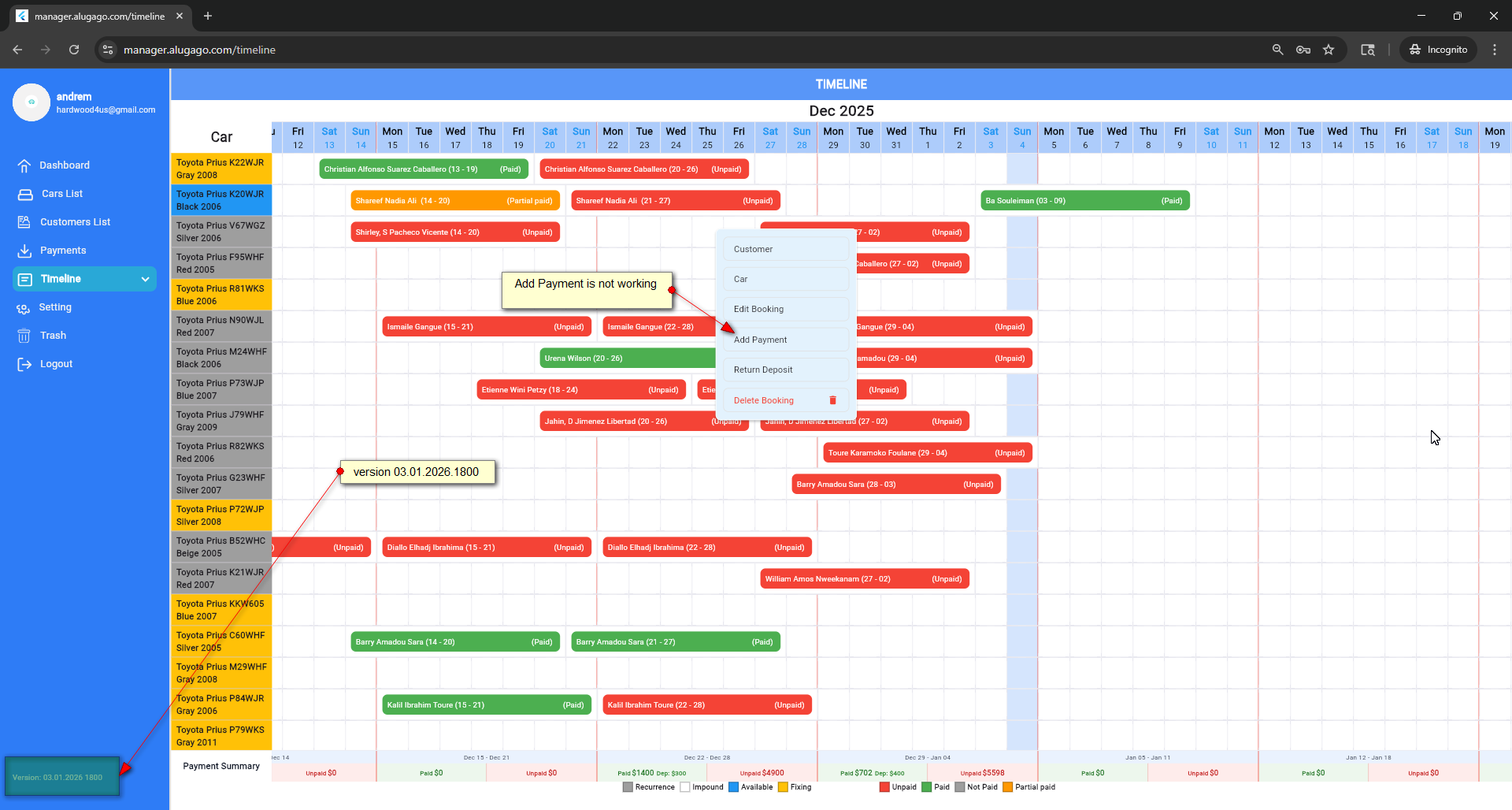 I am not able to add a payment to the rental